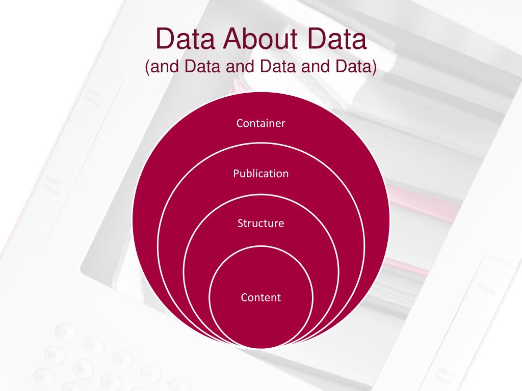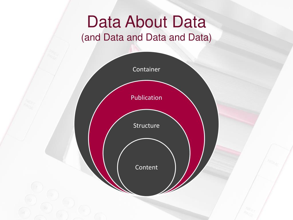 A little extra information never hurt anybody, right? • Title • title-type (main, subtitle, edition, short, etc.) • display-sequence • Creator • role (author, illustrator, editor, etc.) • display-sequence