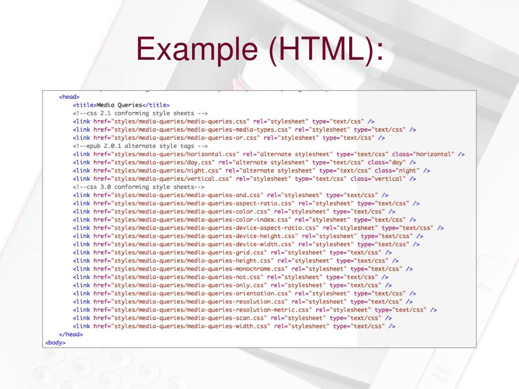 Other Reliable Queries • Orientation (portrait, landscape) • Color (alone or min/max) • Width/Height (min/max, device) • Aspect Ratio (min/max, device—changes with orientation sometimes) • Unreliable queries • Resolution • Monochrome • Color-index
