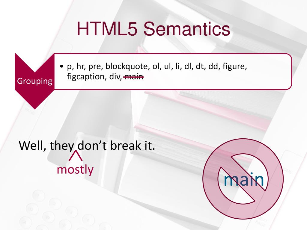 HTML5 Semantics • Super Reliable: • a, b, strong, em, I, small, s, cite, var, u, sup, sub • Reliable within acceptable parameters: • code, samp, kbd • Meh: • mark, bdo, q, dfn • I’m sorry, did you say something?: • abbr, time