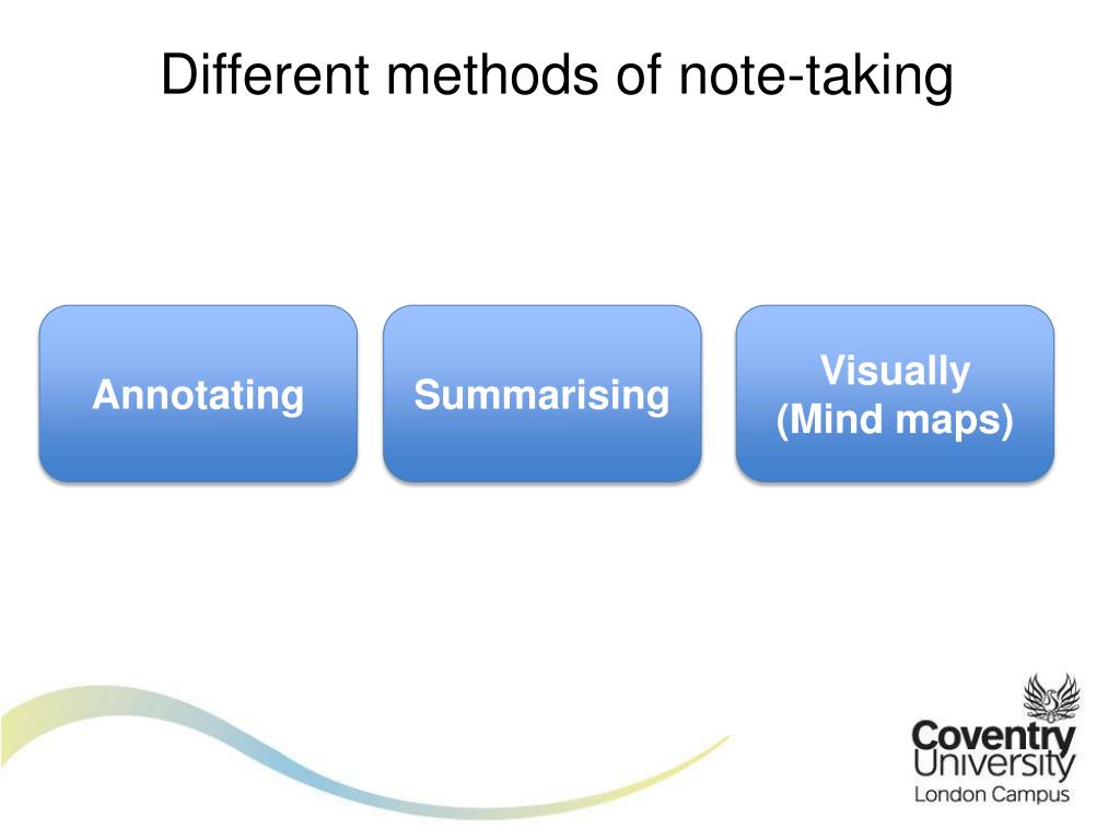 Different methods of note-taking Annotating Summarising Visually (Mind maps)