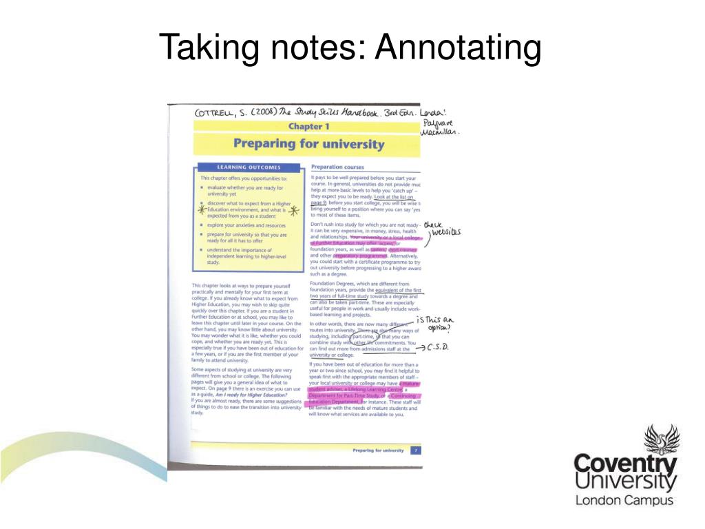 Taking notes: Summarising Cottrell, S. (2008) The Study Skills Handbook. 3rdedn. London: Palgrave Macmillan Page 7: It is best to prepare properly for university course: ways to prepared include foundation courses, access or short courses from the university or local college. It is also possible to do foundation degree, which is equivalent to two years study – this can be taken part time. There are people who can offer advice, including a mature student adviser, life-long learning – see the university for advice.