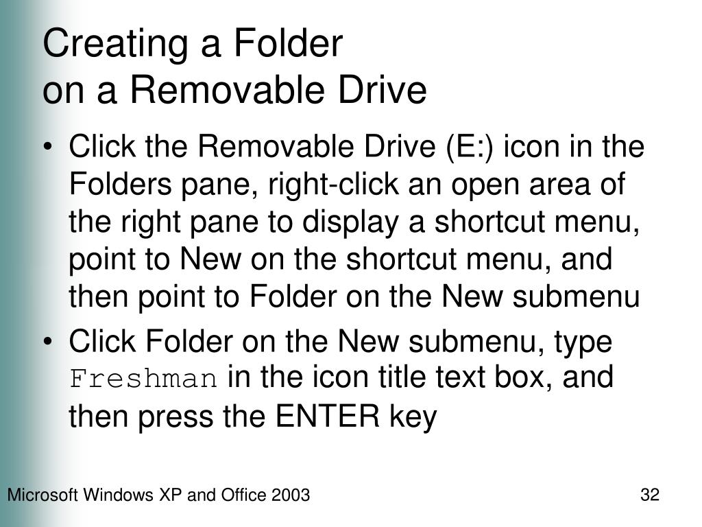 Creating a Folder on a Removable Drive • Click the Removable Drive (E:) icon in the Folders pane, right-click an open area of the right pane to display a shortcut menu, point to New on the shortcut menu, and then point to Folder on the New submenu • Click Folder on the New submenu, type Freshman in the icon title text box, and then press the ENTER key
