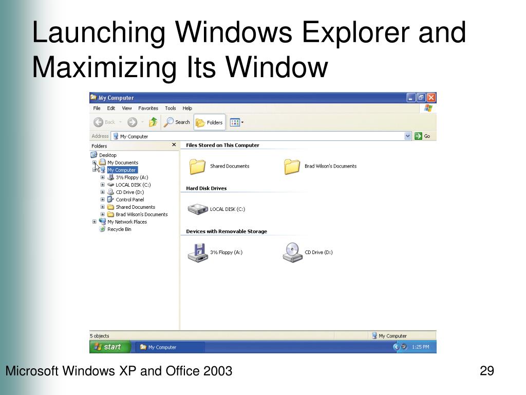 Maximizing and Restoring a Window • Point to the Maximize button on the title bar of the My Computer window • Click the Maximize button • See figure on next slide • Point to the Restore Down button on the title bar of the My Computer window • Click the Restore Down button