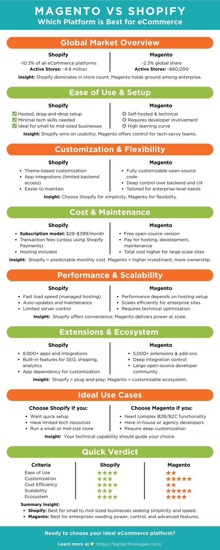 This infographic highlights key differences between Magento (Adobe Commerce) and Shopify u2014 including market share, ease of use, customization, cost, and best-fit use cases. Whether youu2019re starting a small store or scaling an enterprise, your ideal platform depends on your goals, resources, and growth plans.<br><br>Learn more: https://kgntechnologies.com/magento-vs-shopify-best-ecommerce-platform/