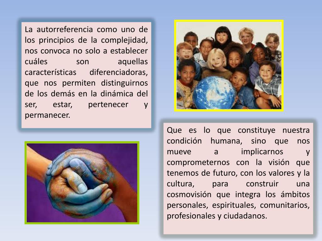 La autorreferencia como uno de los principios de la complejidad, nos convoca no solo a establecer cuáles son aquellas características diferenciadoras, que nos permiten distinguirnos de los demás en la dinámica del ser, estar, pertenecer y permanecer. Que es lo que constituye nuestra condición humana, sino que nos mueve a implicarnos y comprometernos con la visión que tenemos de futuro, con los valores y la cultura, para construir una cosmovisión que integra los ámbitos personales, espirituales, comunitarios, profesionales y ciudadanos.