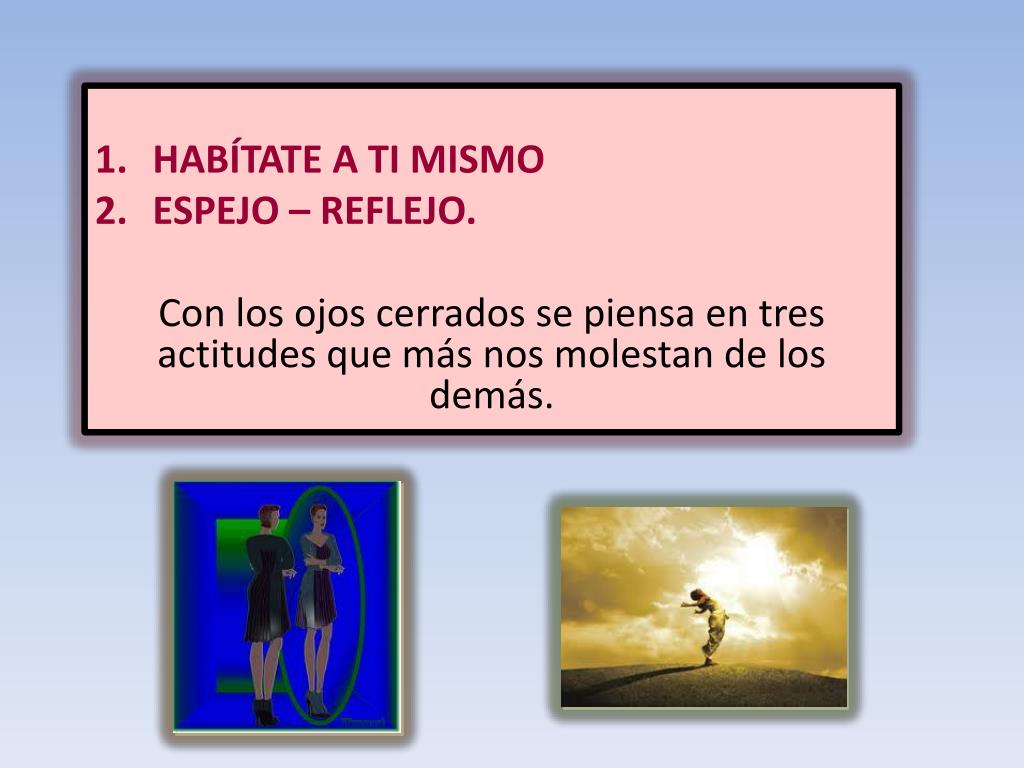 HABÍTATE A TI MISMO ESPEJO – REFLEJO. Con los ojos cerrados se piensa en tres actitudes que más nos molestan de los demás.