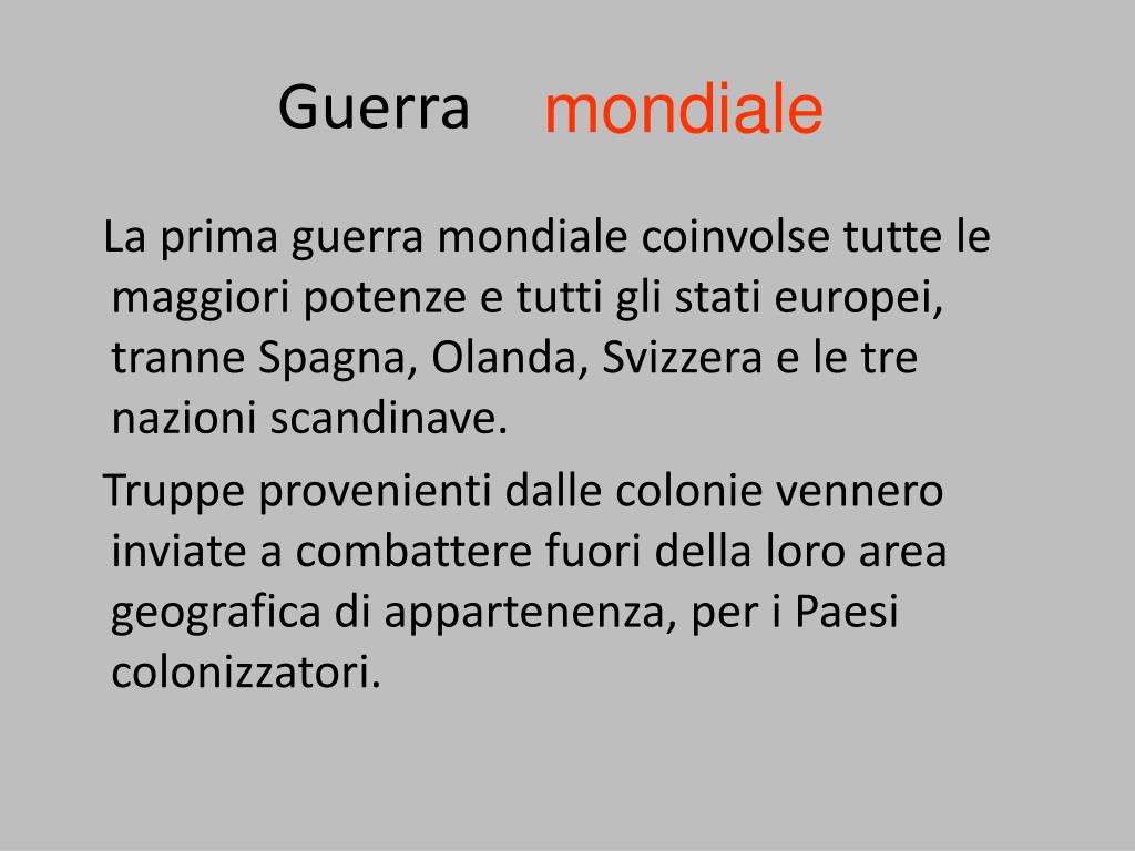 Guerra mondiale La prima guerra mondiale coinvolse tutte le maggiori potenze e tutti gli stati europei, tranne Spagna, Olanda, Svizzera e le tre nazioni scandinave. Truppe provenienti dalle colonie vennero inviate a combattere fuori della loro area geografica di appartenenza, per i Paesi colonizzatori.