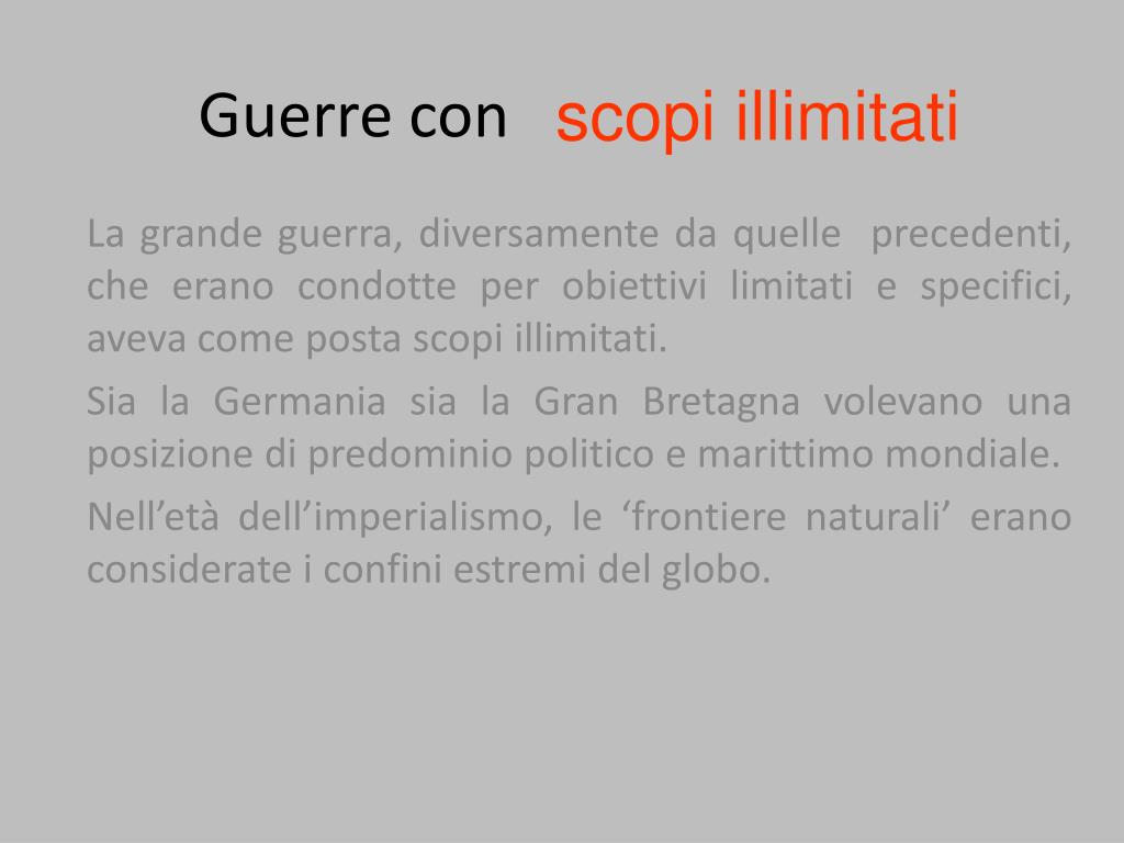 scopi illimitati Guerre con La grande guerra, diversamente da quelle precedenti, che erano condotte per obiettivi limitati e specifici, aveva come posta scopi illimitati. Sia la Germania sia la Gran Bretagna volevano una posizione di predominio politico e marittimo mondiale. Nell’età dell’imperialismo, le ‘frontiere naturali’ erano considerate i confini estremi del globo.