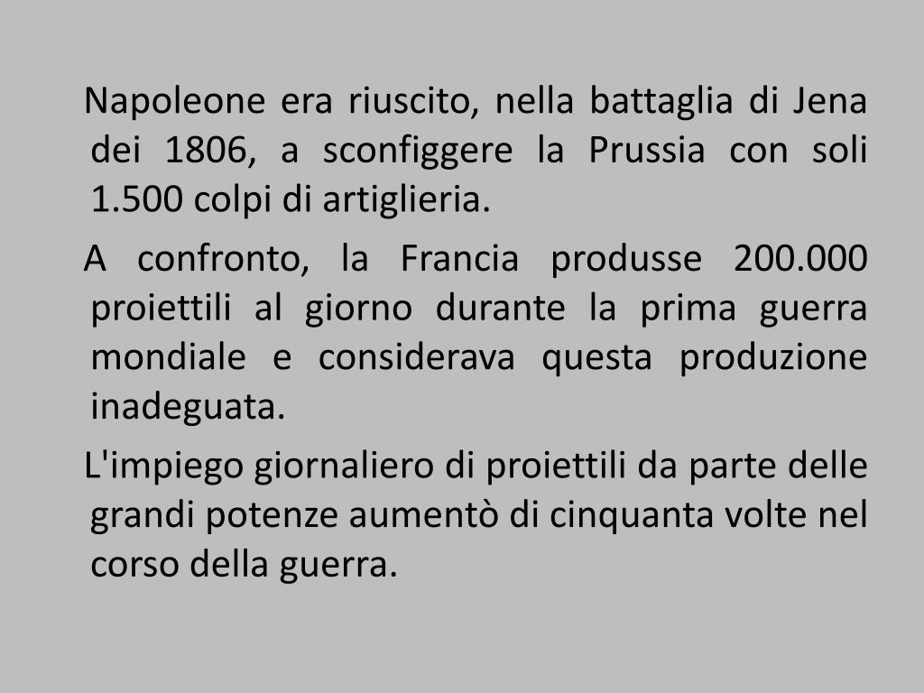 Napoleone era riuscito, nella battaglia di Jena dei 1806, a sconfiggere la Prussia con soli 1.500 colpi di artiglieria. A confronto, la Francia produsse 200.000 proiettili al giorno durante la prima guerra mondiale e considerava questa produzione inadeguata. L'impiego giornaliero di proiettili da parte delle grandi potenze aumentò di cinquanta volte nel corso della guerra.