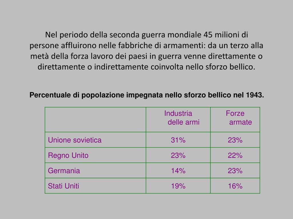 Nel periodo della seconda guerra mondiale 45 milioni di persone affluirono nelle fabbriche di armamenti: da un terzo alla metà della forza lavoro dei paesi in guerra venne direttamente o direttamente o indirettamente coinvolta nello sforzo bellico. Percentuale di popolazione impegnata nello sforzo bellico nel 1943.