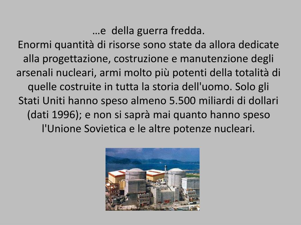 …e della guerra fredda. Enormi quantità di risorse sono state da allora dedicate alla progettazione, costruzione e manutenzione degli arsenali nucleari, armi molto più potenti della totalità di quelle costruite in tutta la storia dell'uomo. Solo gli Stati Uniti hanno speso almeno 5.500 miliardi di dollari (dati 1996); e non si saprà mai quanto hanno speso l'Unione Sovietica e le altre potenze nucleari.
