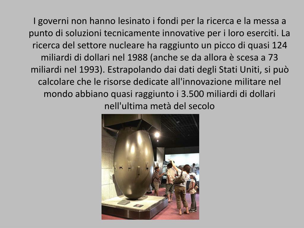 I governi non hanno lesinato i fondi per la ricerca e la messa a punto di soluzioni tecnicamente innovative per i loro eserciti. La ricerca del settore nucleare ha raggiunto un picco di quasi 124 miliardi di dollari nel 1988 (anche se da allora è scesa a 73 miliardi nel 1993). Estrapolando dai dati degli Stati Uniti, si può calcolare che le risorse dedicate all'innovazione militare nel mondo abbiano quasi raggiunto i 3.500 miliardi di dollari nell'ultima metà del secolo