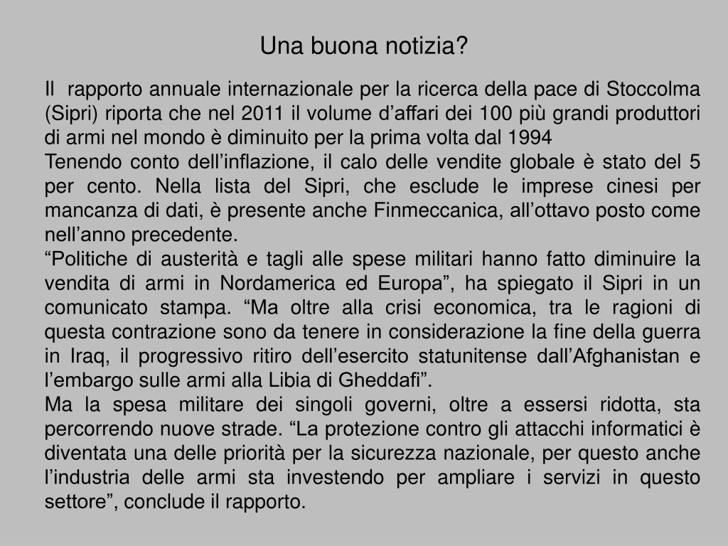 Una buona notizia? Il rapporto annuale internazionale per la ricerca della pace di Stoccolma (Sipri) riporta che nel 2011 il volume d’affari dei 100 più grandi produttori di armi nel mondo è diminuito per la prima volta dal 1994 Tenendo conto dell’inflazione, il calo delle vendite globale è stato del 5 per cento. Nella lista del Sipri, che esclude le imprese cinesi per mancanza di dati, è presente anche Finmeccanica, all’ottavo posto come nell’anno precedente. “Politiche di austerità e tagli alle spese militari hanno fatto diminuire la vendita di armi in Nordamerica ed Europa”, ha spiegato il Sipri in un comunicato stampa. “Ma oltre alla crisi economica, tra le ragioni di questa contrazione sono da tenere in considerazione la fine della guerra in Iraq, il progressivo ritiro dell’esercito statunitense dall’Afghanistan e l’embargo sulle armi alla Libia di Gheddafi”. Ma la spesa militare dei singoli governi, oltre a essersi ridotta, sta percorrendo nuove strade. “La protezione contro gli attacchi informatici è diventata una delle priorità per la sicurezza nazionale, per questo anche l’industria delle armi sta investendo per ampliare i servizi in questo settore”, conclude il rapporto.