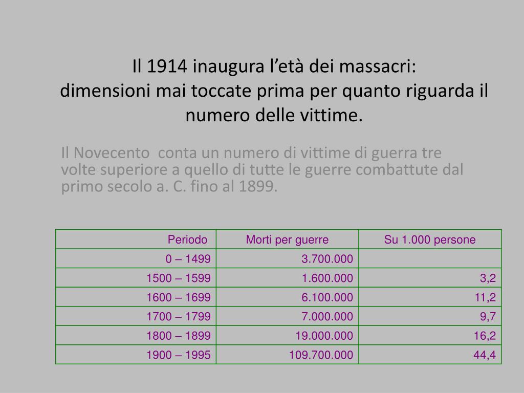 Il 1914 inaugura l’età dei massacri:dimensioni mai toccate prima per quanto riguarda il numero delle vittime. Il Novecento conta un numero di vittime di guerra tre volte superiore a quello di tutte le guerre combattute dal primo secolo a. C. fino al 1899.
