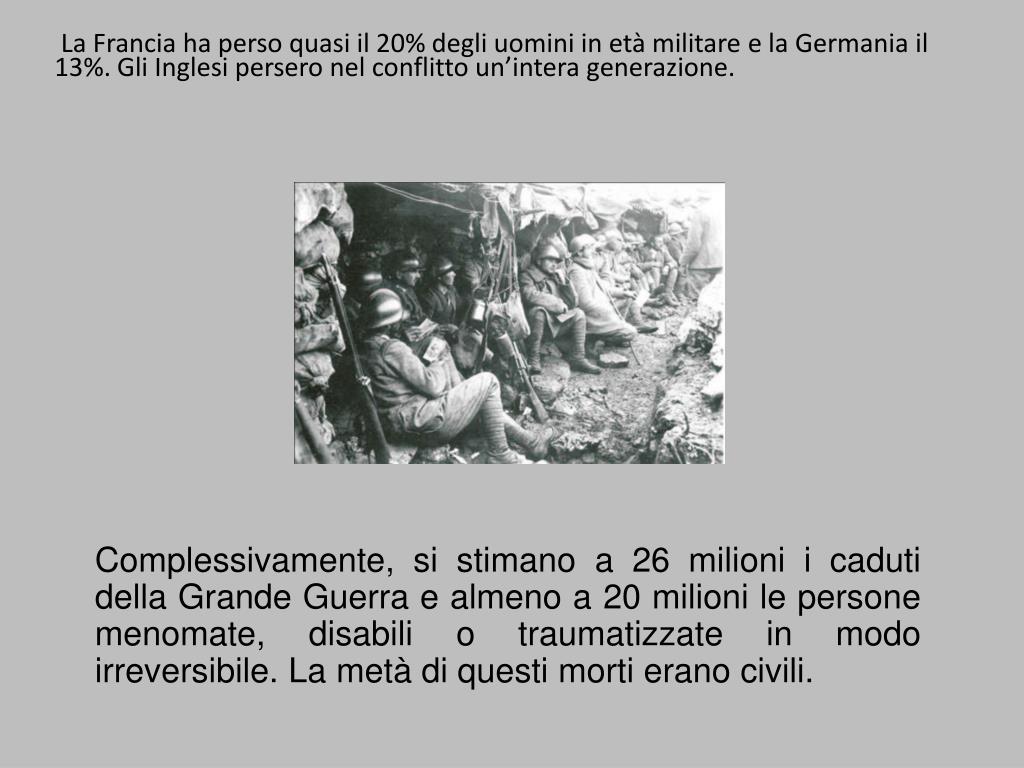 La Francia ha perso quasi il 20% degli uomini in età militare e la Germania il 13%. Gli Inglesi persero nel conflitto un’intera generazione. Complessivamente, si stimano a 26 milioni i caduti della Grande Guerra e almeno a 20 milioni le persone menomate, disabili o traumatizzate in modo irreversibile. La metà di questi morti erano civili.