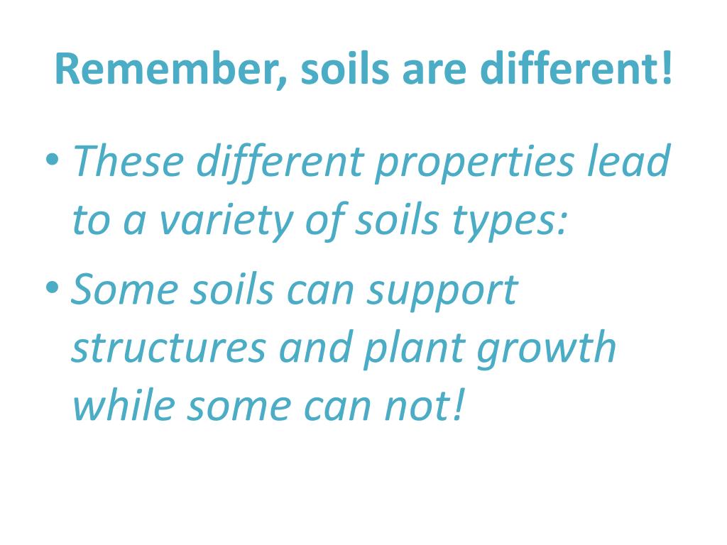 Remember, soils are different! • These different properties lead to a variety of soils types: • Some soils can support structures and plant growth while some can not!