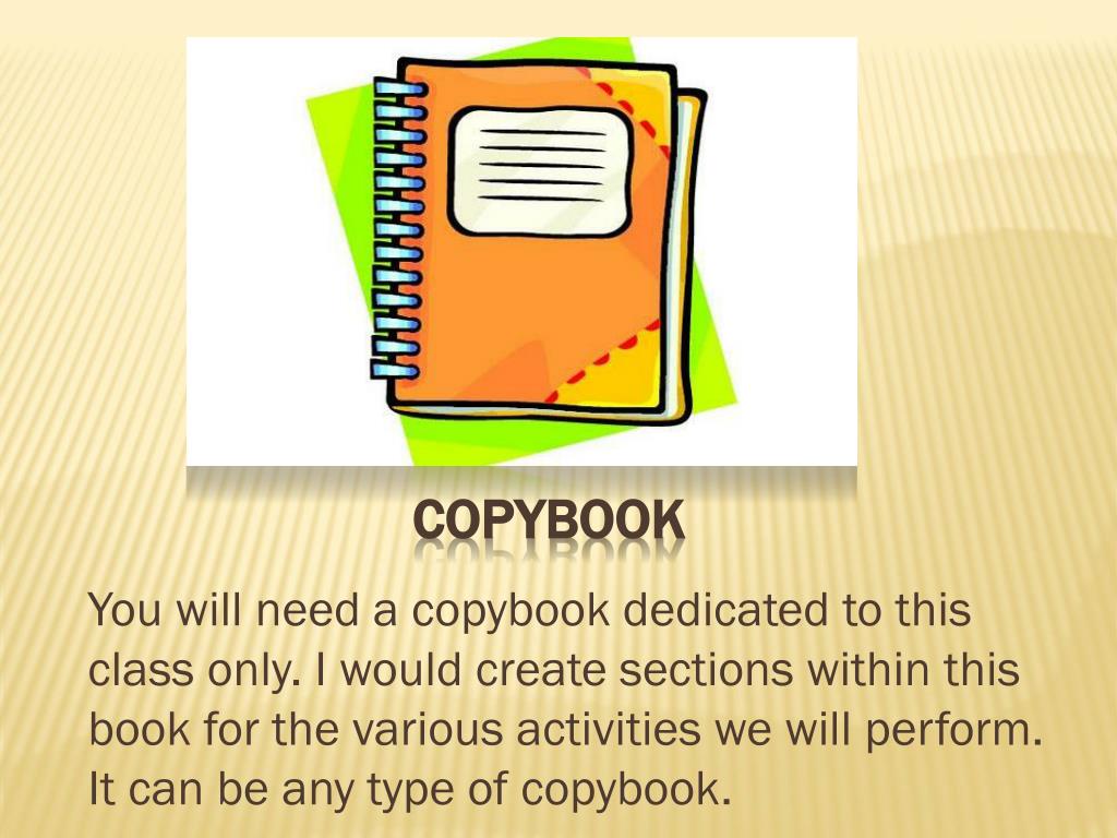 Copybook You will need a copybook dedicated to this class only. I would create sections within this book for the various activities we will perform. It can be any type of copybook.