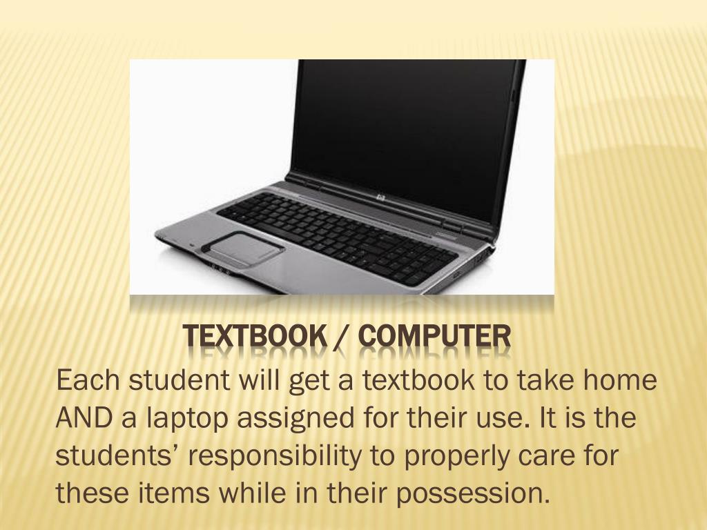 Textbook / Computer Each student will get a textbook to take home AND a laptop assigned for their use. It is the students’ responsibility to properly care for these items while in their possession.