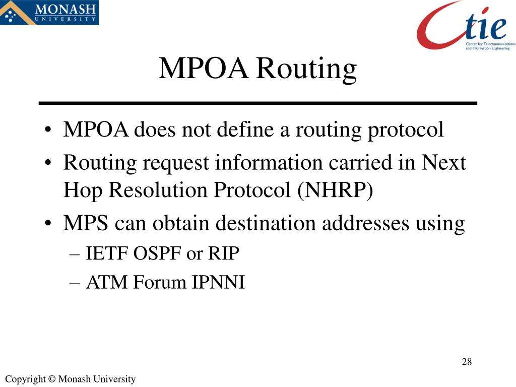 MPOA Routing • MPOA does not define a routing protocol • Routing request information carried in Next Hop Resolution Protocol (NHRP) • MPS can obtain destination addresses using • IETF OSPF or RIP • ATM Forum IPNNI
