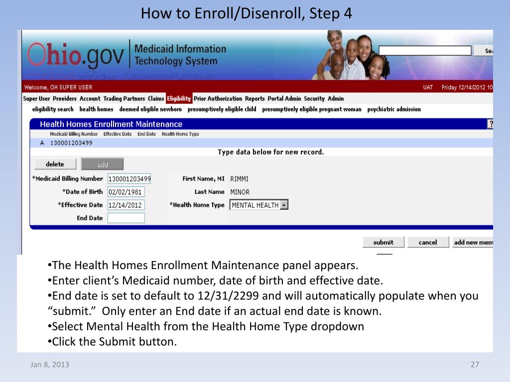 Ohio Medicaid Health Home Program. Webinar: Using the MITS Web Portal to support Health Homes Jan 8, 2013. Agenda. Basic Information – Using MITS Web Portal System Registration System Navigation New Health Home Features: HH Client Enrollment HH Client Search Functions