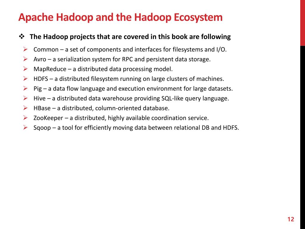 Apache Hadoop and the Hadoop Ecosystem • The Hadoop projects that are covered in this book are following • Common – a set of components and interfaces for filesystems and I/O. • Avro – a serialization system for RPC and persistent data storage. • MapReduce – a distributed data processing model. • HDFS – a distributed filesystem running on large clusters of machines. • Pig – a data flow language and execution environment for large datasets. • Hive – a distributed data warehouse providing SQL-like query language. • HBase– a distributed, column-oriented database. • ZooKeeper – a distributed, highly available coordination service. • Sqoop – a tool for efficiently moving data between relational DB and HDFS.