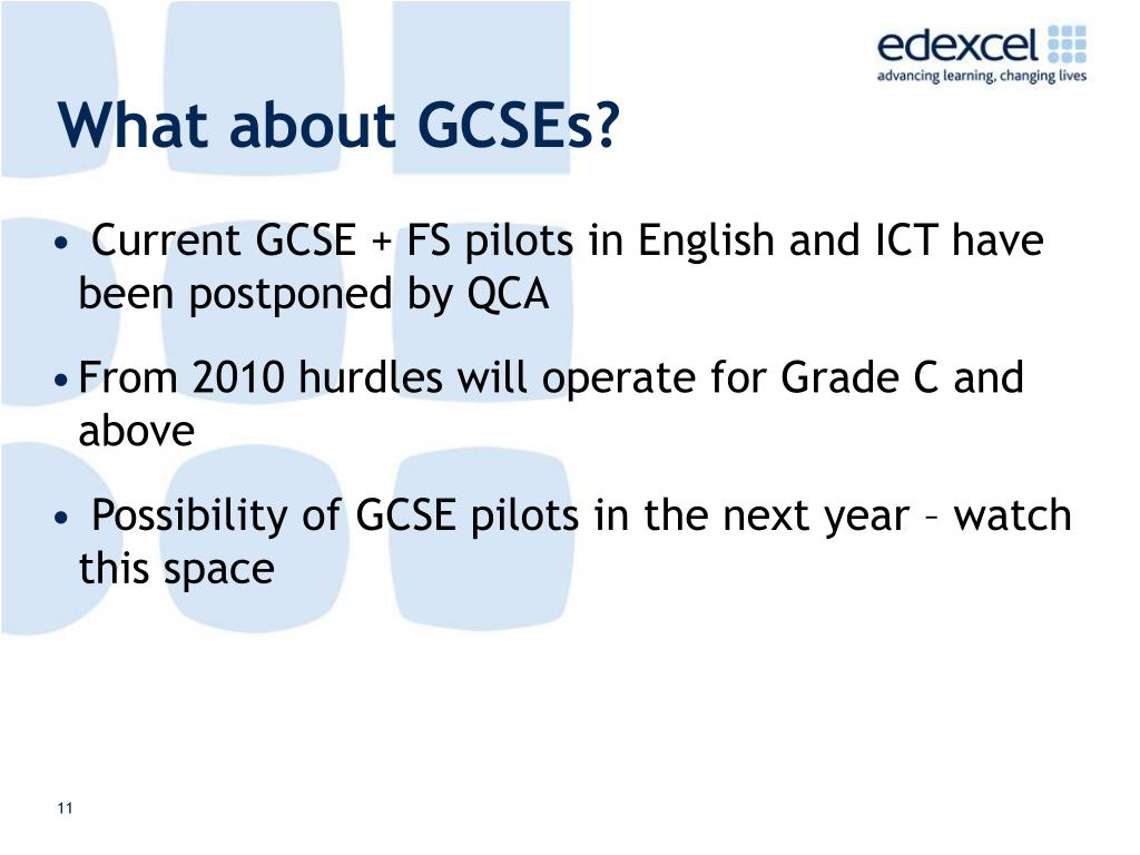 What about GCSEs? • Current GCSE + FS pilots in English and ICT have been postponed by QCA • From 2010 hurdles will operate for Grade C and above • Possibility of GCSE pilots in the next year – watch this space