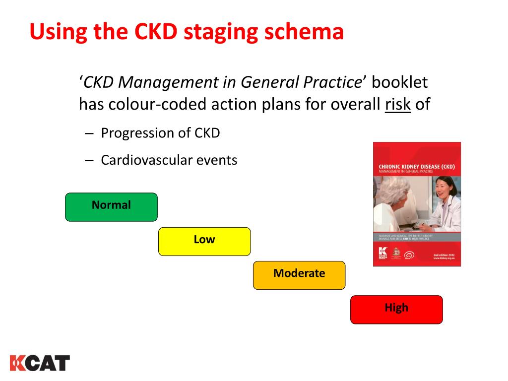Using the CKD staging schema Normal Low Moderate High ‘CKD Management in General Practice’ booklet has colour-coded action plans for overall risk of • Progression of CKD • Cardiovascular events