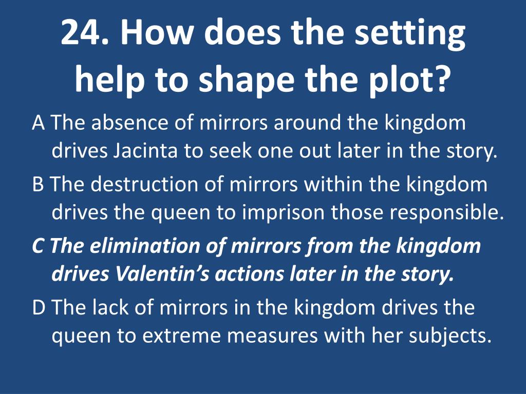 24. How does the setting help to shape the plot? A The absence of mirrors around the kingdom drives Jacinta to seek one out later in the story. B The destruction of mirrors within the kingdom drives the queen to imprison those responsible. C The elimination of mirrors from the kingdom drives Valentin’s actions later in the story. D The lack of mirrors in the kingdom drives the queen to extreme measures with her subjects.