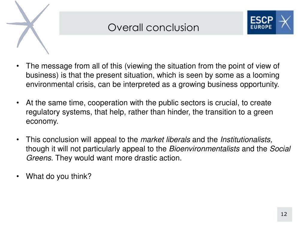 Overall conclusion • The message from all of this (viewing the situation from the point of view of business) is that the present situation, which is seen by some as a looming environmental crisis, can be interpreted as a growing business opportunity. • At the same time, cooperation with the public sectors is crucial, to create regulatory systems, that help, rather than hinder, the transition to a green economy. • This conclusion will appeal to the market liberals and the Institutionalists, though it will not particularly appeal to the Bioenvironmentalists and the Social Greens. They would want more drastic action. • What do you think?