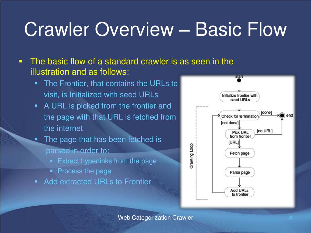 Crawler Overview – Basic Flow • The basic flow of a standard crawler is as seen in the illustration and as follows: • The Frontier, that contains the URLs to visit, is Initialized with seed URLs • A URL is picked from the frontier and the page with that URL is fetched from the internet • The page that has been fetched is parsed in order to: • Extract hyperlinks from the page • Process the page • Add extracted URLs to Frontier Web Categorization Crawler