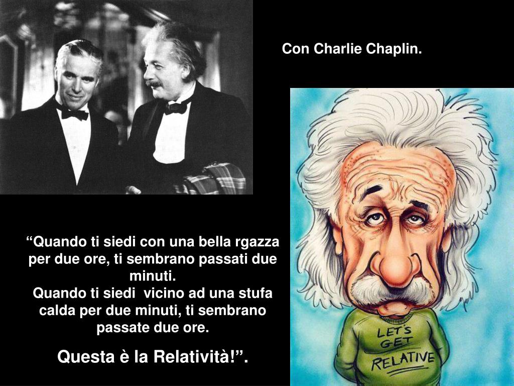 Con Charlie Chaplin. “Quando ti siedi con una bella rgazza per due ore, ti sembrano passati due minuti.Quando ti siedi vicino ad una stufa calda per due minuti, ti sembrano passate due ore. Questa è la Relatività!”.