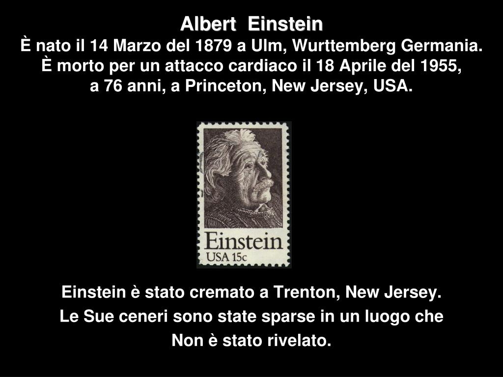 Albert EinsteinÈ nato il 14 Marzo del 1879 a Ulm, Wurttemberg Germania.È morto per un attacco cardiaco il 18 Aprile del 1955, a 76 anni, a Princeton, New Jersey, USA. Einstein è stato cremato a Trenton, New Jersey. Le Sue ceneri sono state sparse in un luogo che Non è stato rivelato.