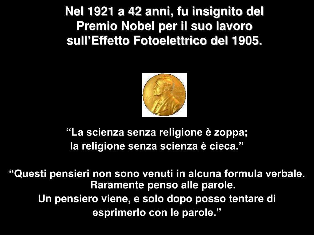 Nel 1921 a 42 anni, fu insignito del Premio Nobel per il suo lavoro sull’Effetto Fotoelettrico del 1905. “La scienza senza religione è zoppa; la religione senza scienza è cieca.” “Questi pensieri non sono venuti in alcuna formula verbale. Raramente penso alle parole. Un pensiero viene, e solo dopo posso tentare di esprimerlo con le parole.”