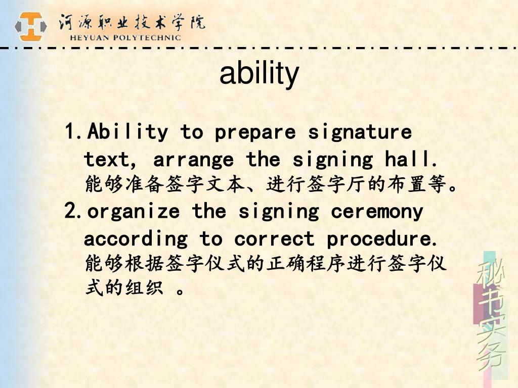 ability 1.Ability to prepare signature text, arrange the signing hall.能够准备签字文本、进行签字厅的布置等。 2.organize the signing ceremony according to correct procedure. 能够根据签字仪式的正确程序进行签字仪式的组织 。