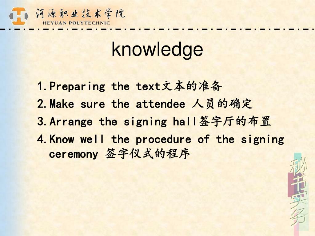 knowledge 1.Preparing the text文本的准备 2.Make sure the attendee 人员的确定 3.Arrange the signing hall签字厅的布置 4.Know well the procedure of the signing ceremony 签字仪式的程序