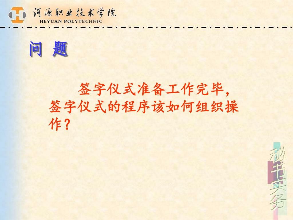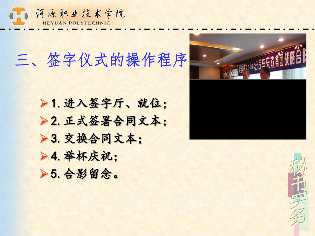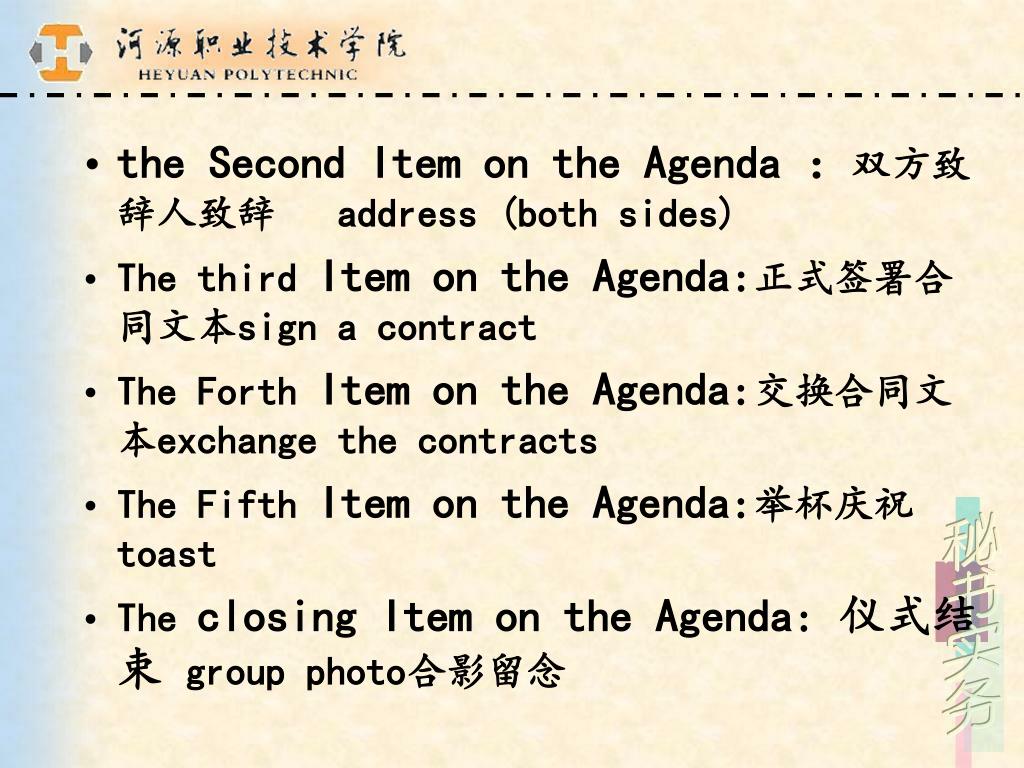 the Second Item on the Agenda :双方致辞人致辞 address (both sides) • The third Item on the Agenda:正式签署合同文本sign a contract • The Forth Item on the Agenda:交换合同文本exchange the contracts • The Fifth Item on the Agenda:举杯庆祝 toast • The closing Item on the Agenda: 仪式结束 group photo合影留念
