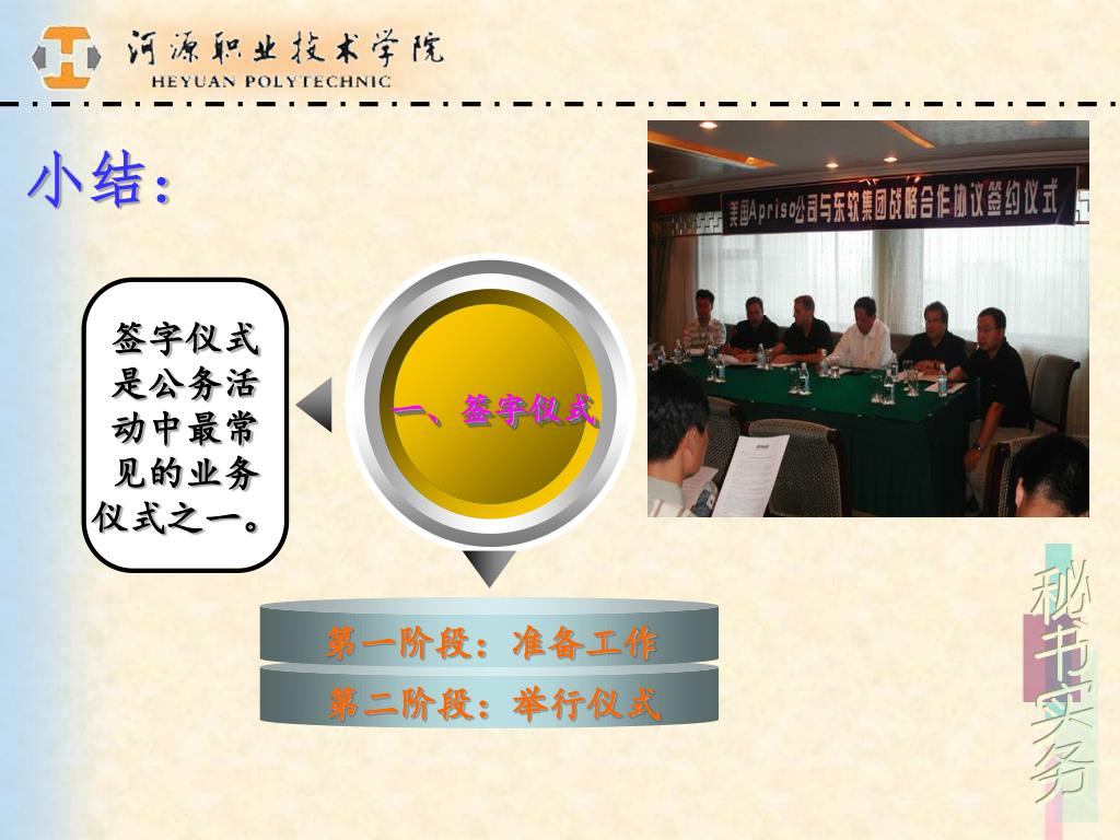 小结: 签字仪式 是公务活 动中最常 见的业务 仪式之一。 一、签字仪式 第一阶段:准备工作 第二阶段:举行仪式