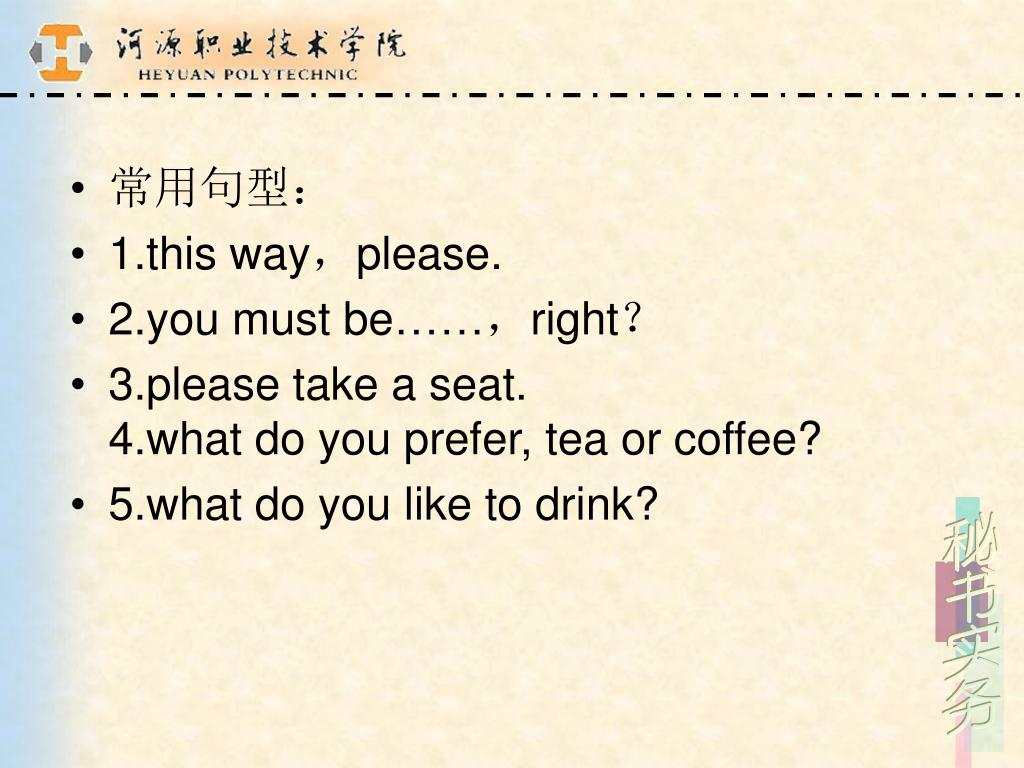 常用句型: • 1.this way,please. • 2.you must be……,right? • 3.please take a seat.4.what do you prefer, tea or coffee? • 5.what do you like to drink?