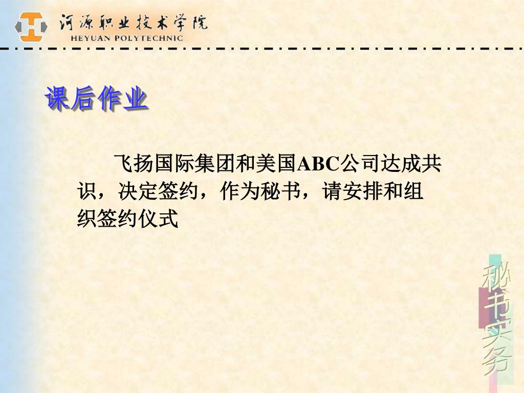 课后作业 飞扬国际集团和美国ABC公司达成共识,决定签约,作为秘书,请安排和组织签约仪式