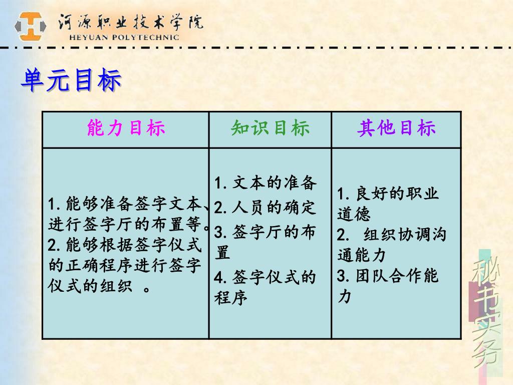 学习情境 -- 达成合作意向. 任务一 组织签字仪式 Organize a signing ceremony. ability. 1.Ability to prepare signature text, arrange the signing hall. 能够准备签字文本、进行签字厅的布置等。 2.organize the signing ceremony according to correct procedure. 能够根据签字仪式的正确程序进行签字仪式的组织 。. knowledge. 1.Preparing the text 文本的准备