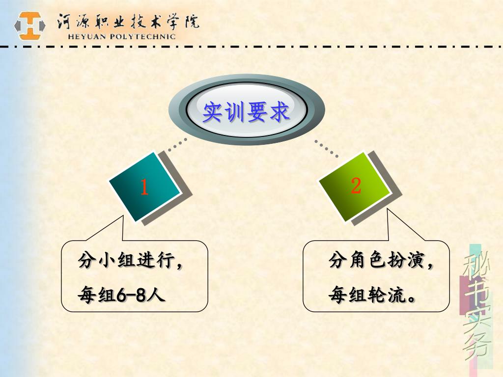 实训要求 2 1 分角色扮演, 每组轮流。 分小组进行, 每组6-8人