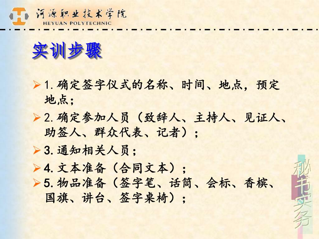 实训步骤 • 1.确定签字仪式的名称、时间、地点,预定地点; • 2.确定参加人员(致辞人、主持人、见证人、助签人、群众代表、记者); • 3.通知相关人员; • 4.文本准备(合同文本); • 5.物品准备(签字笔、话筒、会标、香槟、国旗、讲台、签字桌椅);