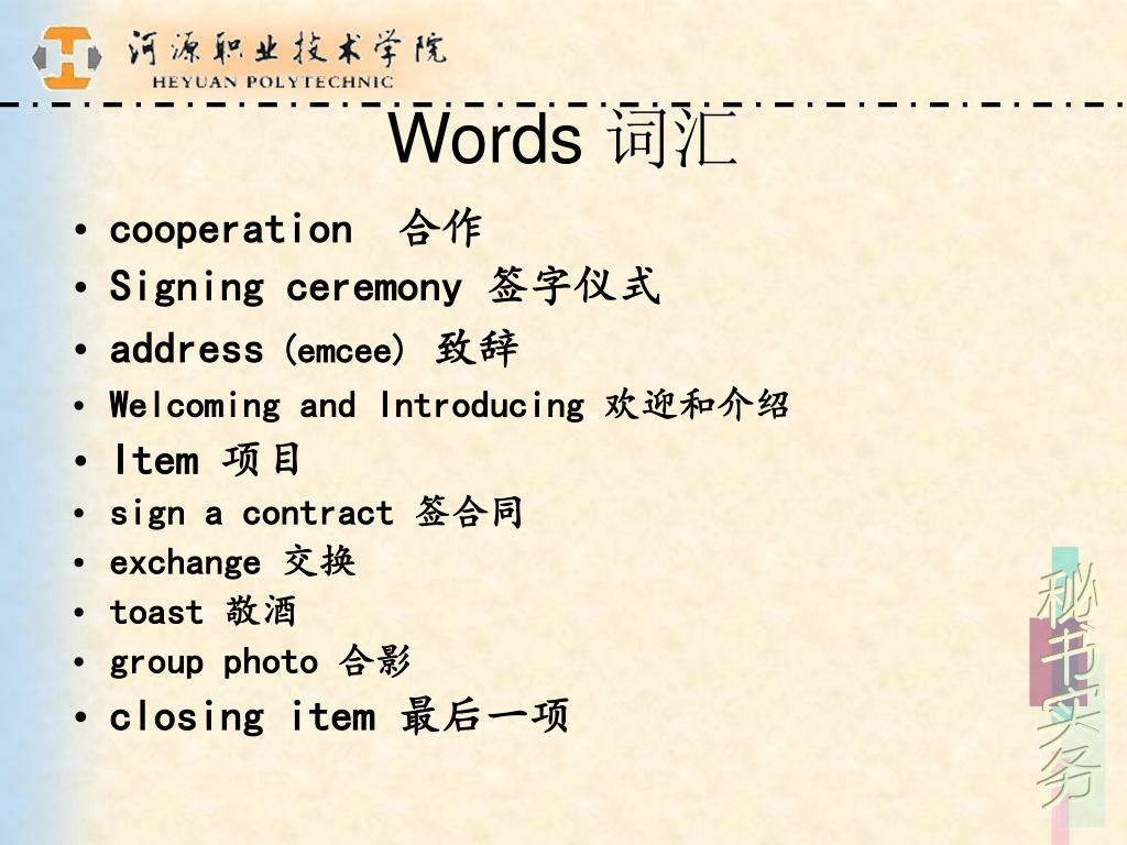 Words 词汇 • cooperation 合作 • Signing ceremony 签字仪式 • address(emcee)致辞 • Welcoming and Introducing 欢迎和介绍 • Item 项目 • sign a contract 签合同 • exchange 交换 • toast 敬酒 • group photo 合影 • closing item 最后一项