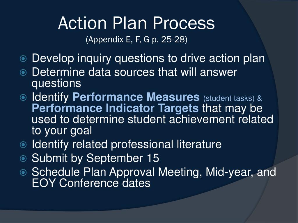 Action Plan Process(Appendix E, F, G p. 25-28) • Develop inquiry questions to drive action plan • Determine data sources that will answer questions • Identify Performance Measures (student tasks) & Performance Indicator Targetsthat may be used to determine student achievement related to your goal • Identify related professional literature • Submit by September 15 • Schedule Plan Approval Meeting, Mid-year, and EOY Conference dates