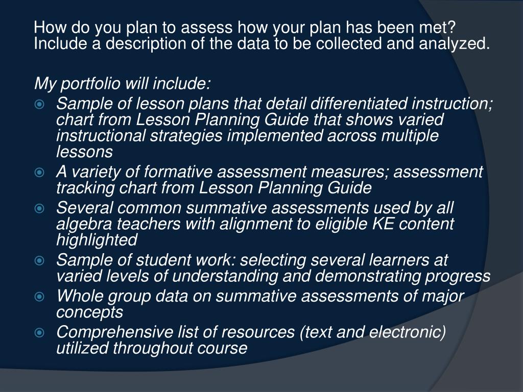 How do you plan to assess how your plan has been met? Include a description of the data to be collected and analyzed. My portfolio will include: • Sample of lesson plans that detail differentiated instruction; chart from Lesson Planning Guide that shows varied instructional strategies implemented across multiple lessons • A variety of formative assessment measures; assessment tracking chart from Lesson Planning Guide • Several common summative assessments used by all algebra teachers with alignment to eligible KE content highlighted • Sample of student work: selecting several learners at varied levels of understanding and demonstrating progress • Whole group data on summative assessments of major concepts • Comprehensive list of resources (text and electronic) utilized throughout course