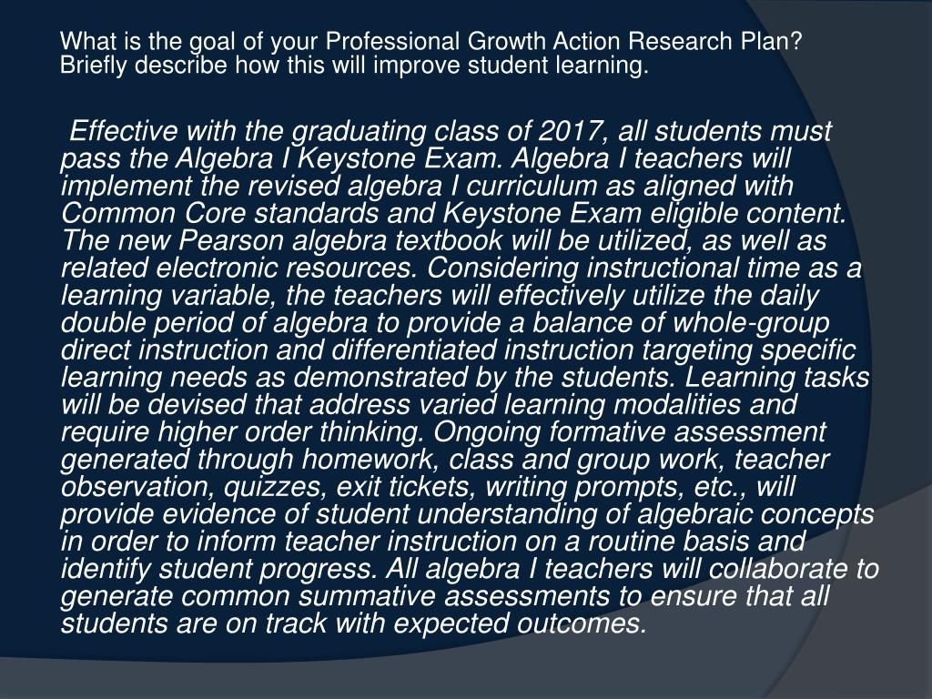 What is the goal of your Professional Growth Action Research Plan? Briefly describe how this will improve student learning. Effective with the graduating class of 2017, all students must pass the Algebra I Keystone Exam. Algebra I teachers will implement the revised algebra I curriculum as aligned with Common Core standards and Keystone Exam eligible content. The new Pearson algebra textbook will be utilized, as well as related electronic resources. Considering instructional time as a learning variable, the teachers will effectively utilize the daily double period of algebra to provide a balance of whole-group direct instruction and differentiated instruction targeting specific learning needs as demonstrated by the students. Learning tasks will be devised that address varied learning modalities and require higher order thinking. Ongoing formative assessment generated through homework, class and group work, teacher observation, quizzes, exit tickets, writing prompts, etc., will provide evidence of student understanding of algebraic concepts in order to inform teacher instruction on a routine basis and identify student progress. All algebra I teachers will collaborate to generate common summative assessments to ensure that all students are on track with expected outcomes.