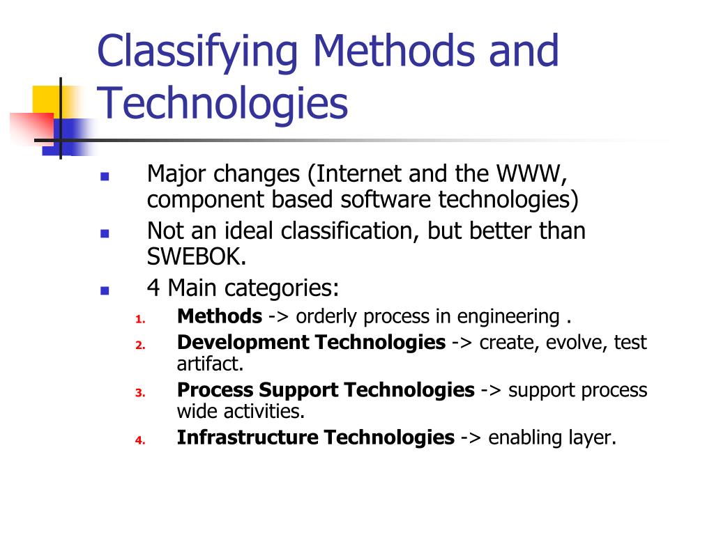 Classifying Methods and Technologies • Major changes (Internet and the WWW, component based software technologies) • Not an ideal classification, but better than SWEBOK. • 4 Main categories: • Methods -> orderly process in engineering . • Development Technologies -> create, evolve, test artifact. • Process Support Technologies -> support process wide activities. • Infrastructure Technologies -> enabling layer.