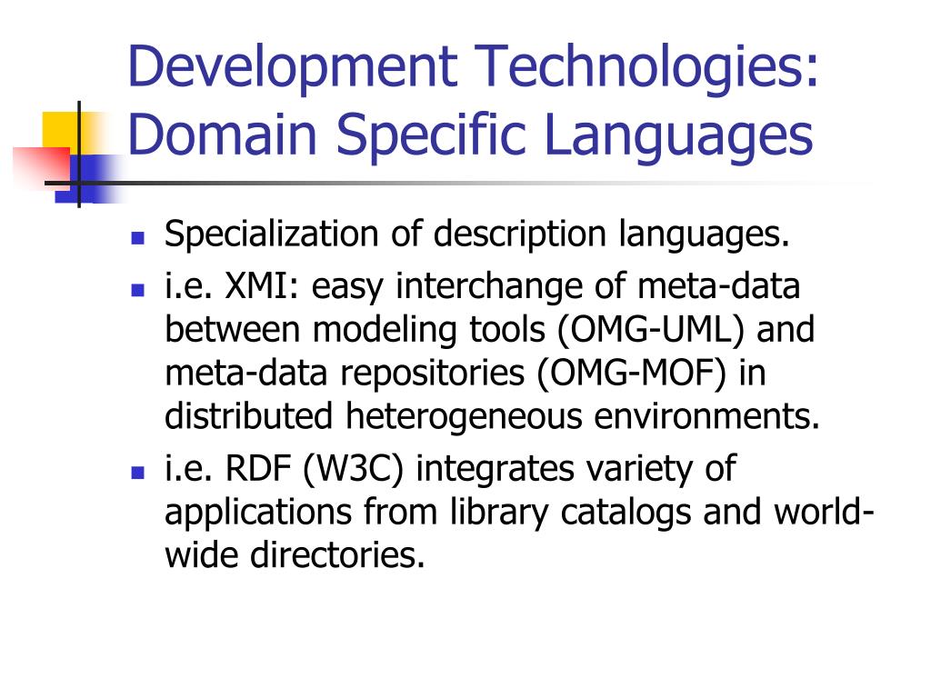 Development Technologies: Domain Specific Languages • Specialization of description languages. • i.e. XMI: easy interchange of meta-data between modeling tools (OMG-UML) and meta-data repositories (OMG-MOF) in distributed heterogeneous environments. • i.e. RDF (W3C) integrates variety of applications from library catalogs and world-wide directories.