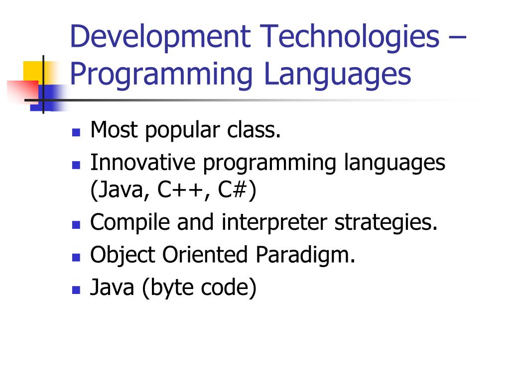 Development Technologies – Programming Languages • Most popular class. • Innovative programming languages (Java, C++, C#) • Compile and interpreter strategies. • Object Oriented Paradigm. • Java (byte code)