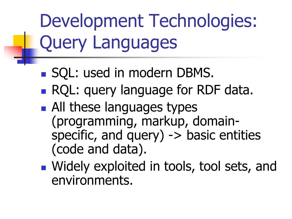 Development Technologies: Query Languages • SQL: used in modern DBMS. • RQL: query language for RDF data. • All these languages types (programming, markup, domain-specific, and query) -> basic entities (code and data). • Widely exploited in tools, tool sets, and environments.